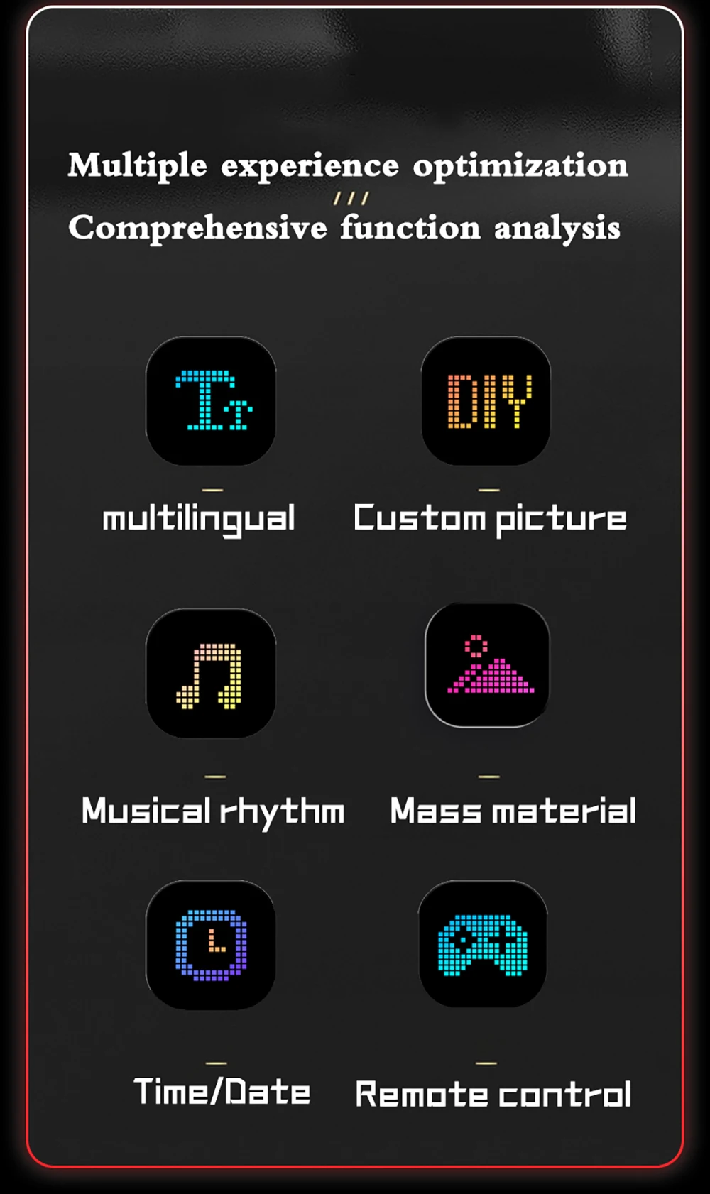 A matriz de LED usa 2121 contas de lâmpada RGB coloridas. Esta matriz de LED de alta qualidade pode não apenas emitir luz de alta intensidade, mas também tem baixo consumo de energia, e o efeito colorido será mais brilhante e atraente.