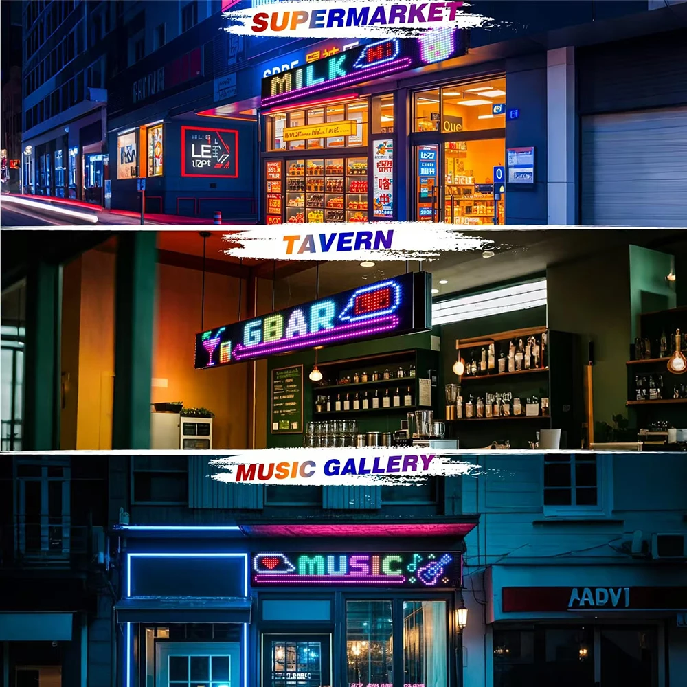 Os sinais de LED são controlados por um aplicativo conectado por Bluetooth que suporta a conexão de vários monitores de LED ao mesmo tempo para tornar sua loja ainda mais atraente, com muitos padrões divertidos e animações integrados ao aplicativo.Seu telefone pode ser personalizado com mais facilidade com padrões e texto interessantes para deixar sua loja mais personalizada.